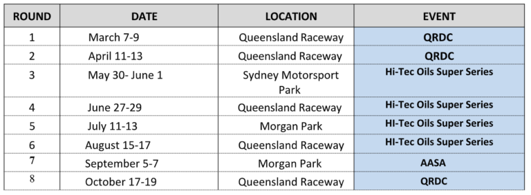 The calendar for the 2025 RTTS is detailed below. Note that each of these rounds will be run in conjunction with each of the circuits or event organizers. Races will consist of sprint races, typically between 10 and 15 laps. Races at these rounds are run under either the AASA or RACERS Rules of Conduct.